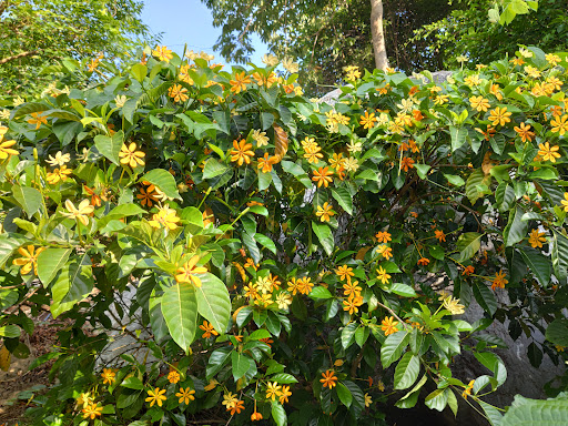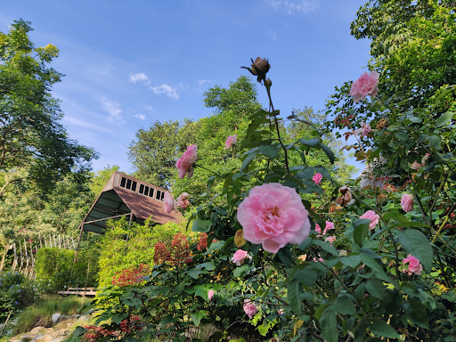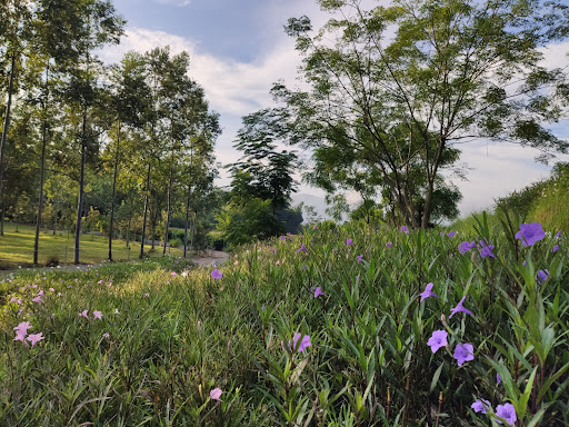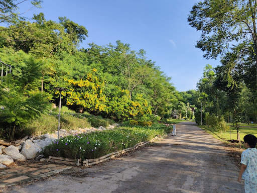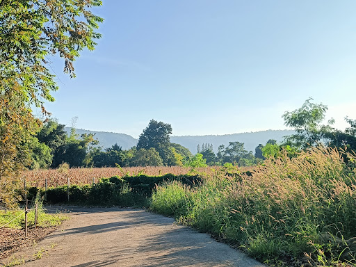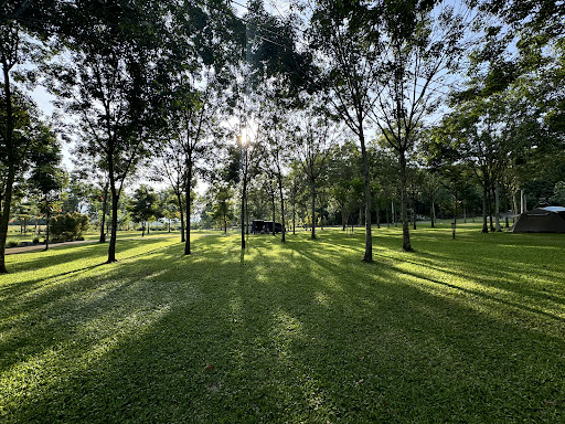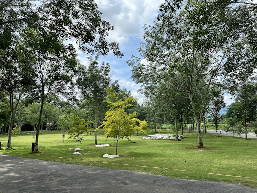 ลานหญ้าสีเขียวขจีใต้ร่มเงาต้นยางพารา บรรยากาศร่มรื่นด้วยดอกไม้บานสะพรั่ง และวิวภูเขาโอบล้อม ช่วงใบไม้เปลี่ยนสีสวยงามตระการตา มุมถ่ายรูปเยอะแยะเต็มไปหมด