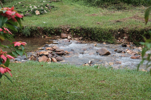 ลำธารน้ำใสไหลผ่าน ลานหญ้าเขียวสวย ต้นน้ำของน้ำตกจ๊อกกระดิ่น ทิวทัศน์ธรรมชาติงดงาม
