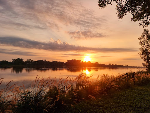 วิวแม่น้ำเจ้าพระยาสวยงามพร้อมพระอาทิตย์ขึ้นในตอนเช้า ที่มีไอหมอกจับผิวน้ำเบาๆ ต้นหูกระจงใหญ่ให้ร่มเงาและลานหญ้านิ่มเท้า เหมาะสำหรับการชมธรรมชาติที่สงบ