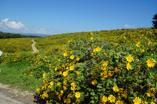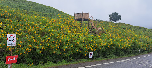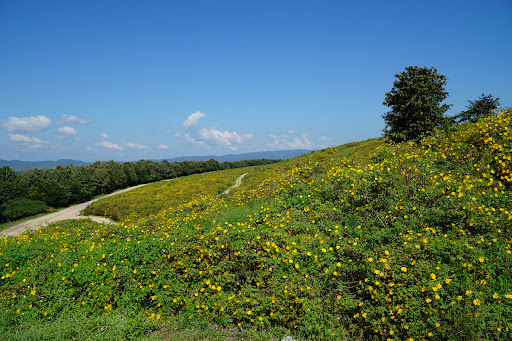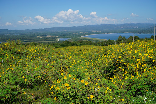 ทุ่งดอกบัวตองกว้างใหญ่สีเหลืองทองที่บานสะพรั่งบนเนินเขา วิวพาโนรามาของภูเขา ทะเลสาบ และโรงไฟฟ้า สวยงามเหมือนภาพวาด โดยเฉพาะในฤดูหนาวช่วงพฤศจิกายนถึงธันวาคม แต่บางครั้งดอกไม้อาจเหลือน้อยหรือโรยแล้ว