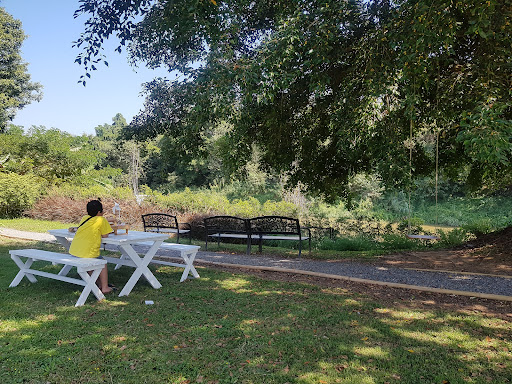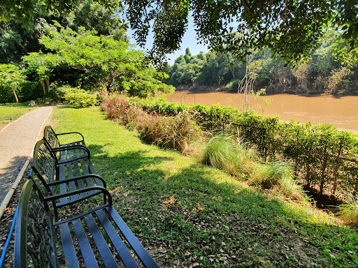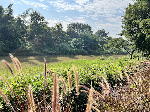 สวยงามสุดๆ! มีทิวทัศน์ริมน้ำที่ร่มรื่นด้วยต้นไม้ใหญ่ เช่น ต้นฉำฉา และดอกไม้น่ารักๆ อย่างดอกทานตะวัน บรรยากาศสีเขียวสบายตา เหมาะสำหรับการถ่ายรูป
