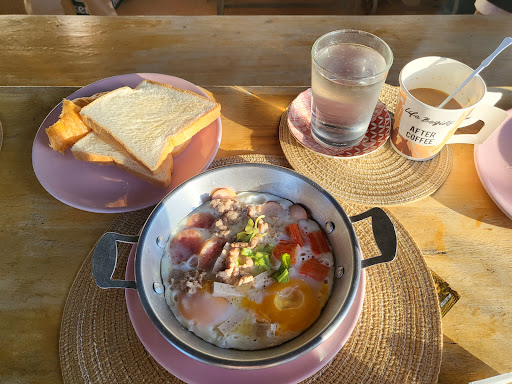 อาหารเช้าอร่อยรวมอยู่ในค่าที่พัก มีข้าวต้ม ไข่ ปาท่องโก๋ กาแฟ น้ำเต้าหู้ และมีบาร์บีคิวตอนเย็น
