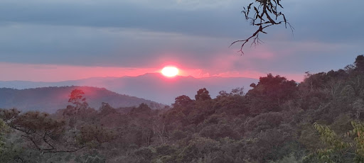 ป่าสนเขียวชอุ่มทอดตัวอยู่รอบๆ ลานกางเต็นท์ มองเห็นพระอาทิตย์ตกดินสวยงามในช่วงเย็น