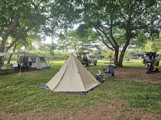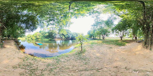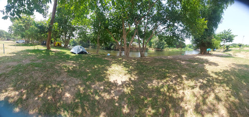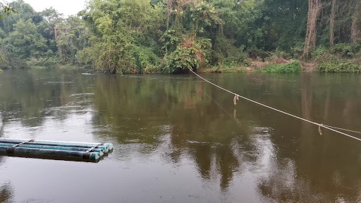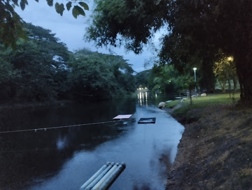 ลานกว้างติดริมน้ำที่มีต้นไม้ใหญ่ให้ร่มเงาและเล่นน้ำได้อย่างปลอดภัย แม้เมื่อเขื่อนปล่อยน้ำ