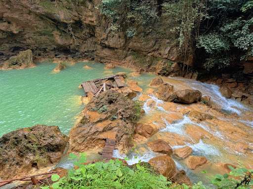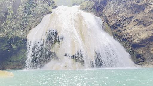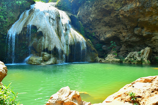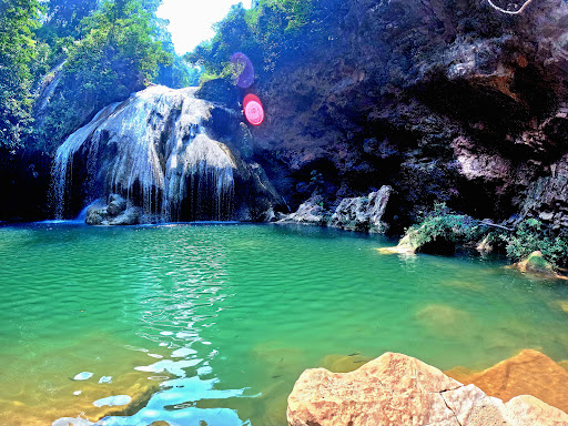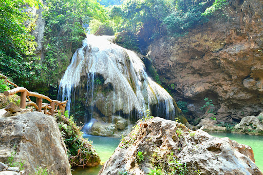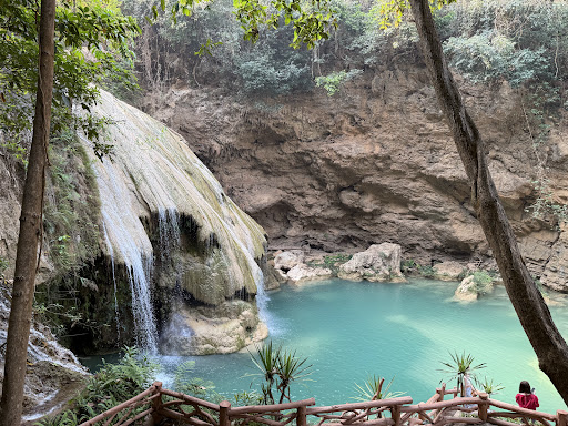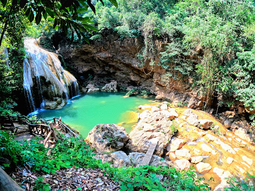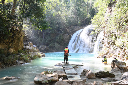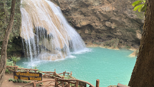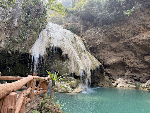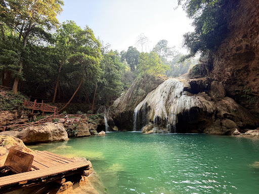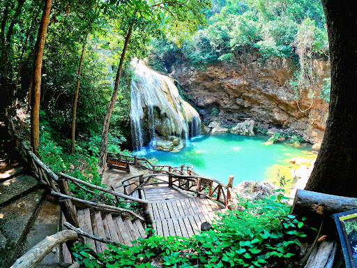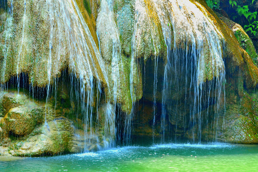 น้ำตกสีฟ้าเทอร์คอยส์หรือเขียวมรกตที่สวยงาม มีชั้นน้ำตกลดหลั่นกัน เกิดจากหินปูน และบรรยากาศธรรมชาติอันเงียบสงบ