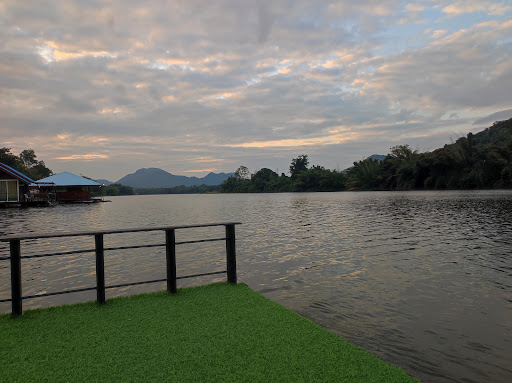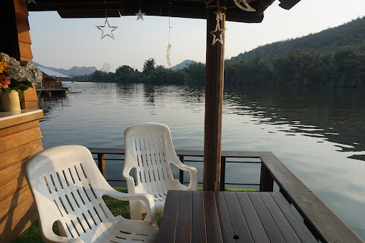 ทิวทัศน์ริมแม่น้ำไทรโยคที่สวยงาม พร้อมวิวภูเขา มองเห็นหมอกเบาๆ ตอนเช้า แสงไฟอบอุ่นยามค่ำคืน และบรรยากาศธรรมชาติเขียวขจี