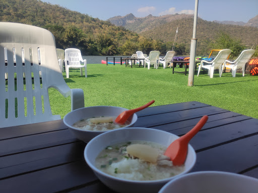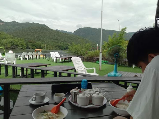 มีบริการหมูกระทะ อาหารตามสั่ง และข้าวต้มไก่ฉีกตอนเช้า ควรสั่งล่วงหน้า บรรยากาศการทานริมน้ำฟินสุดๆ