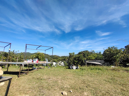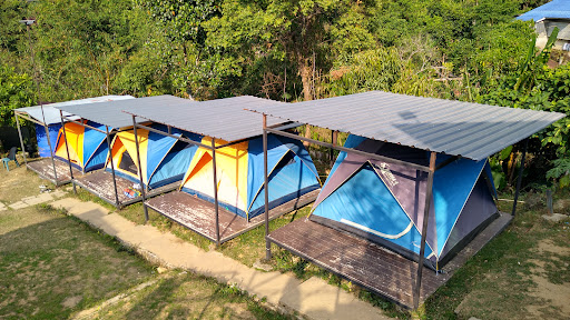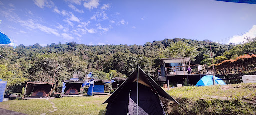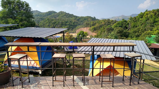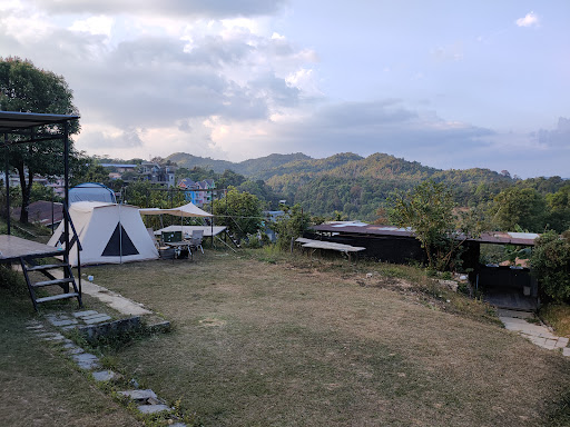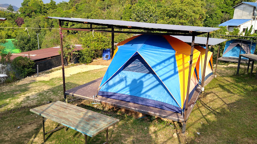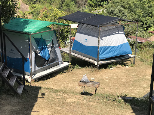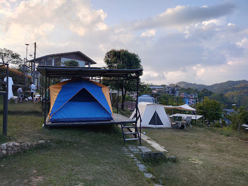 เป็นที่พักแบบกางเต็นท์ บนลานหญ้าและเพิงไม้ยกสูง มีหลังคาให้