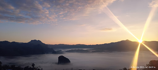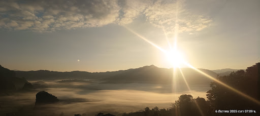 วิวสวยอลังการงานสร้าง! ทะเลหมอกขาวโพลนในยามเช้า พระอาทิตย์ขึ้นสีส้มทองตัดกับภูเขาเขียวขจี และผาช้างน้อยที่เห็นชัดเจน จะบอกว่าสวยจนต้องเก็บภาพไว้ในความทรงจำเลยทีเดียว