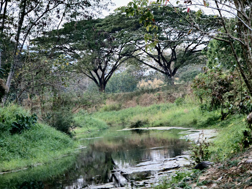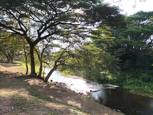 ต้นจามจุรีใหญ่กลางลานที่ให้ร่มเงาและลำธารน้ำใสไหลเย็น สร้างบรรยากาศธรรมชาติที่โดดเด่น