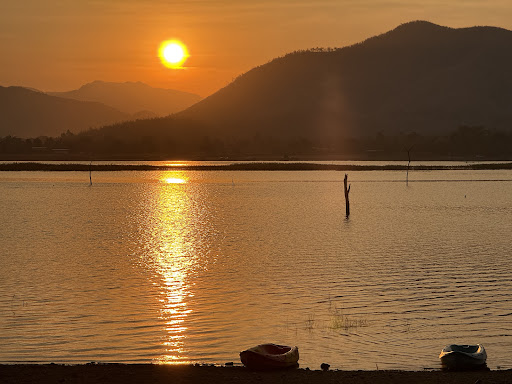 ทิวทัศน์สวยงามด้วยอ่างเก็บน้ำลำตะเพิน ภูเขาเขียวขจี และพระอาทิตย์ตกที่โรแมนติก เหมาะสำหรับถ่ายรูปเก็บความประทับใจ