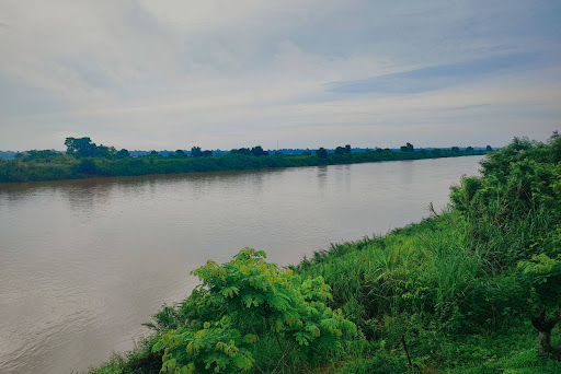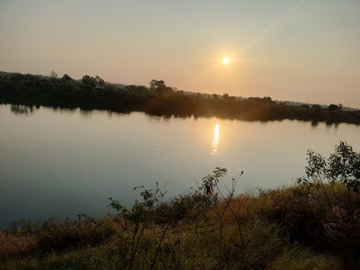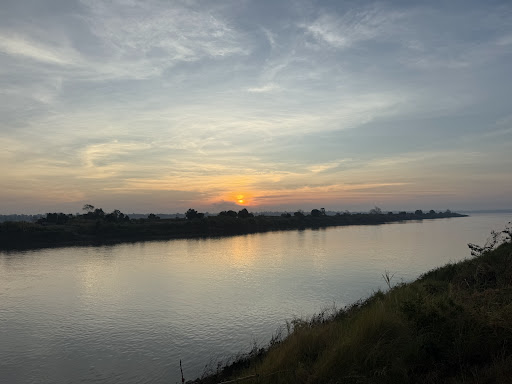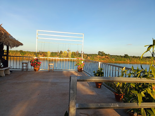 ริมแม่น้ำโขงที่สวยงาม มองเห็นพระอาทิตย์ตกดินชัดเจน บรรยากาศธรรมชาติร่มรื่นด้วยต้นไม้ใหญ่และดอกไม้หอม