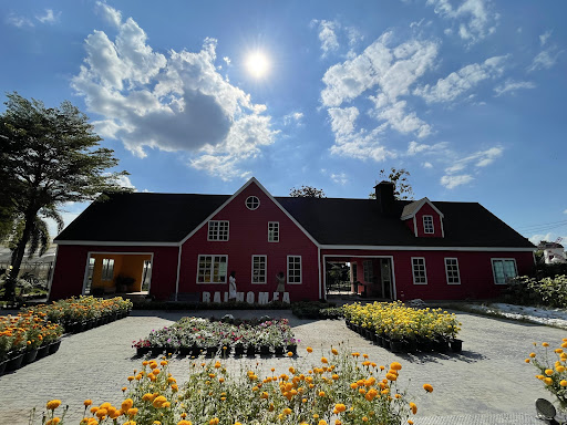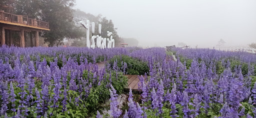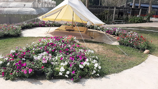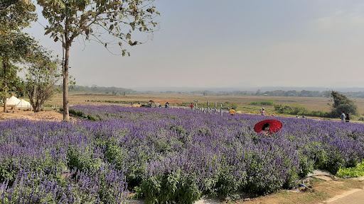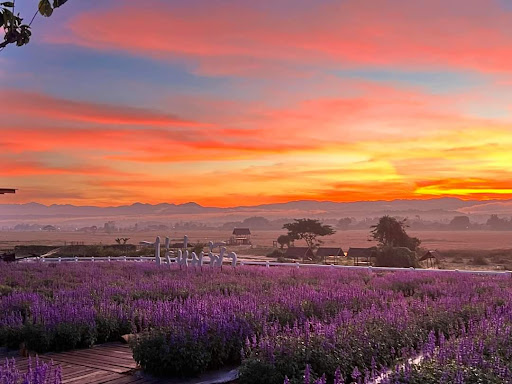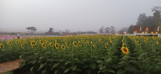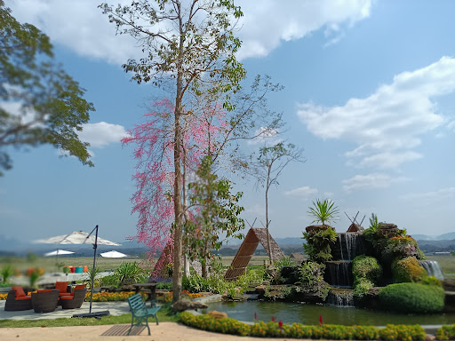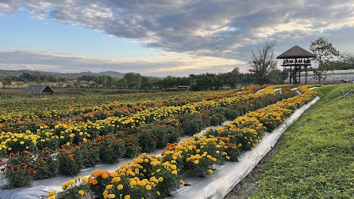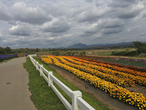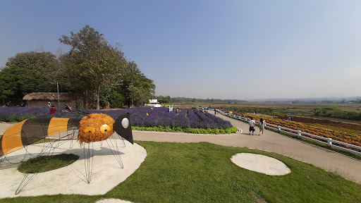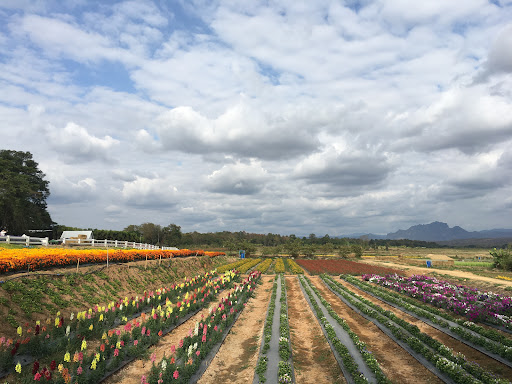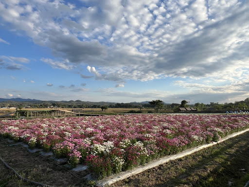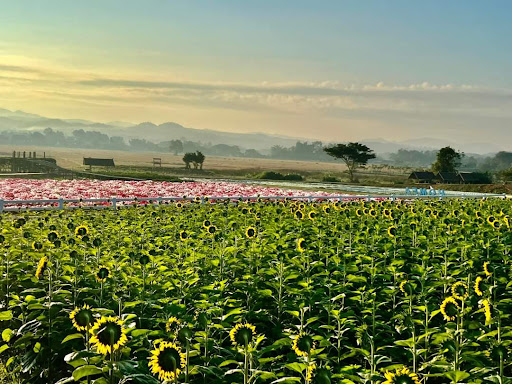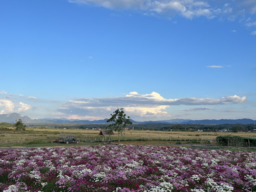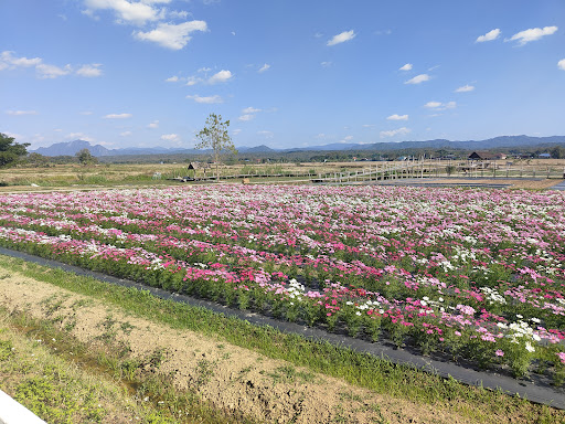 สวนดอกไม้สีสันสดใสท่ามกลางทุ่งนาเขียวขจีและวิวภูเขาที่สวยงาม โดยเฉพาะในฤดูที่ดอกไม้บานสะพรั่ง