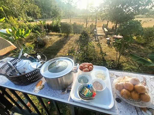 อาหารเช้าดีงาม! ข้าวต้มร้อนๆ กับผลไม้สดๆ อร่อยจนต้องยกนิ้วให้ บางวันมีหมูกระทะจากร้านใกล้เคียงมาส่งถึงที่