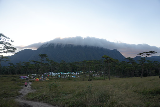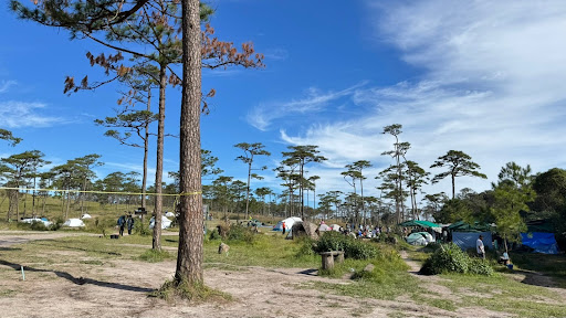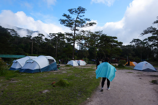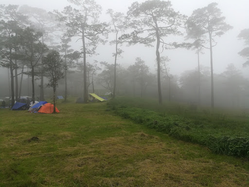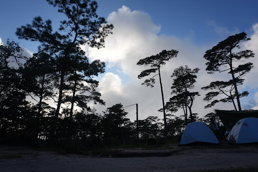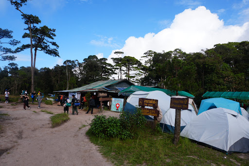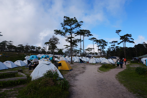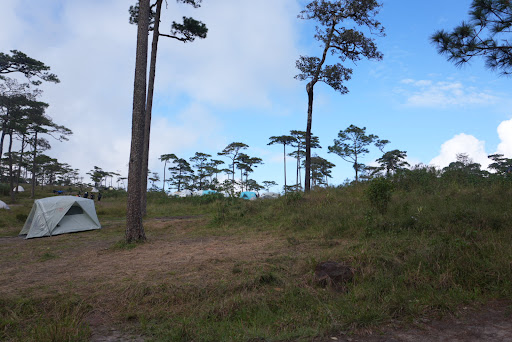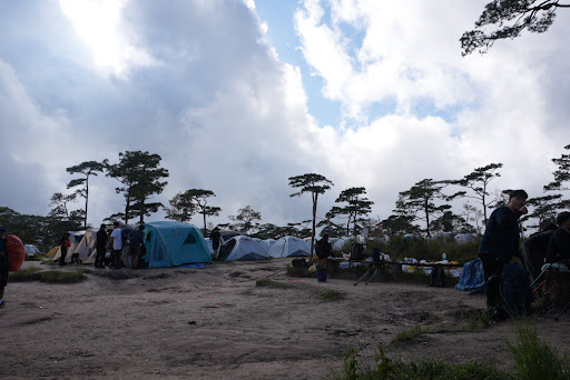 มีลานกางเต็นท์กว้างขวาง สามารถเลือกจุดตั้งแคมป์ได้อย่างอิสระ เต็นท์ให้เช่าจากร้านด้านล่างและนำขึ้นไปกางบนลานได้