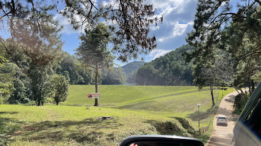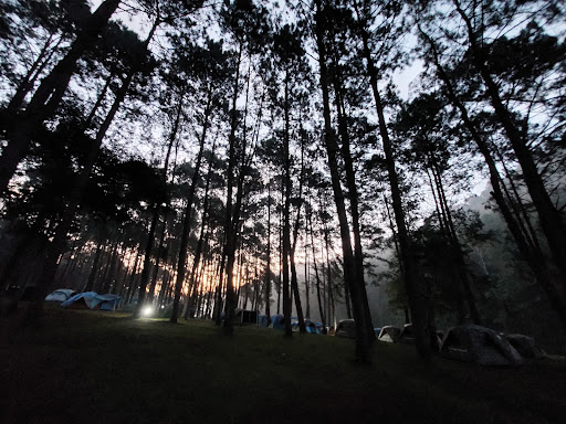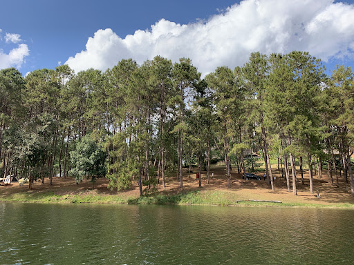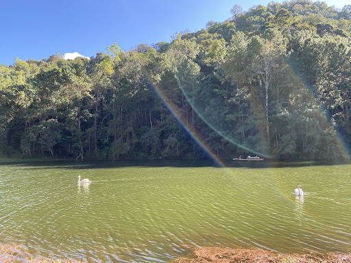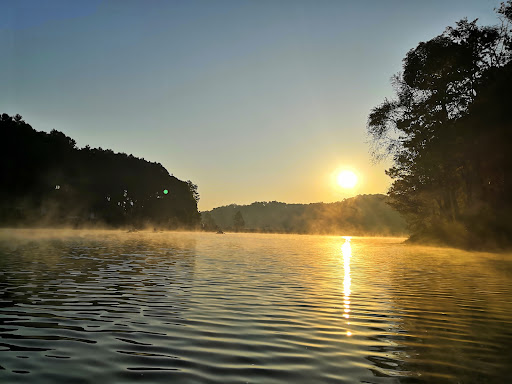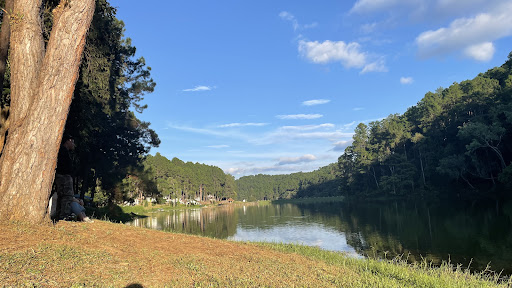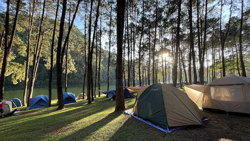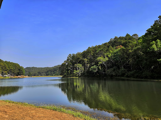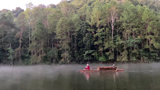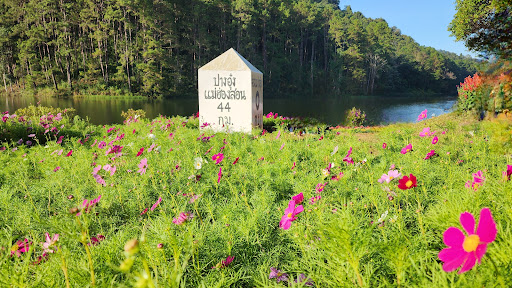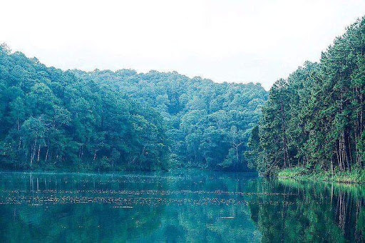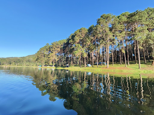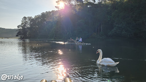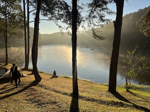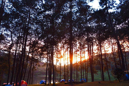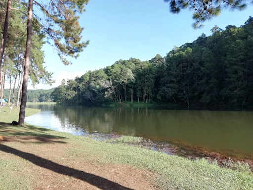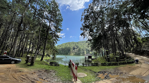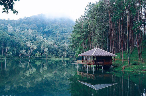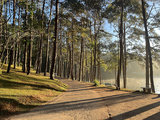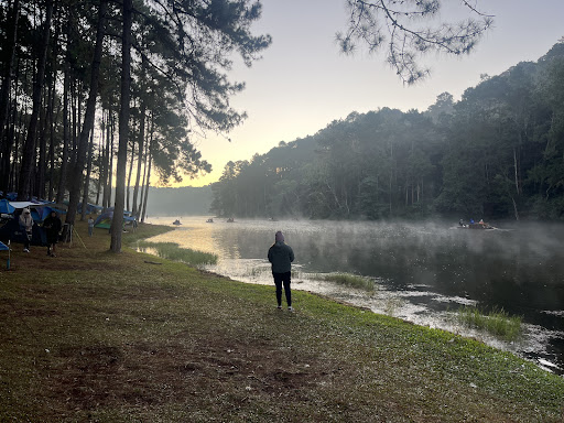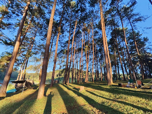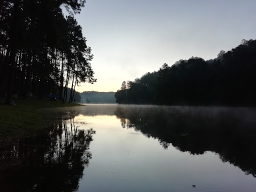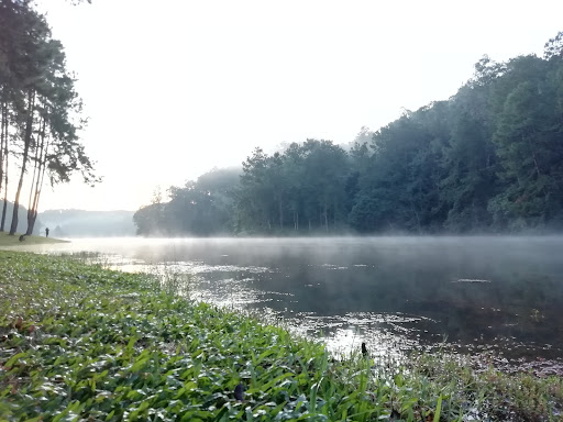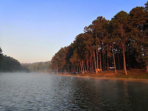 ทิวทัศน์ธรรมชาติสวยงามด้วยป่าสนเขียวขจี วิวอ่างเก็บน้ำยามเช้าที่มีหมอกบางๆ และแสงอาทิตย์ขึ้นส่องกระทบน้ำ สร้างบรรยากาศโรแมนติก
