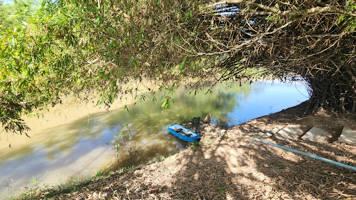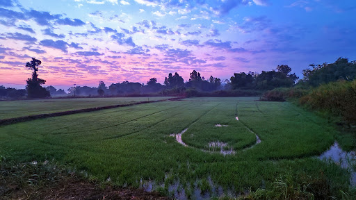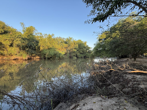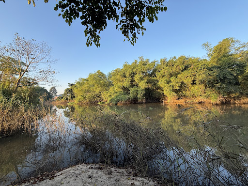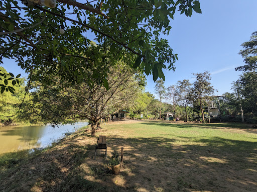วิวแม่น้ำสะแกกรังที่สวยงาม พื้นหญ้าเขียวขจีและต้นไม้ร่มรื่น