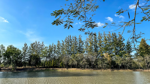 วิวสวยงามติดริมน้ำขนาดใหญ่ มีบ่อปลาและต้นไม้ร่มรื่น บางช่วงมีดอกกัลปพฤกษ์บานสีชมพู ตื่นเช้ามาเจอหมอกและไอน้ำ บรรยากาศธรรมชาติสมบูรณ์