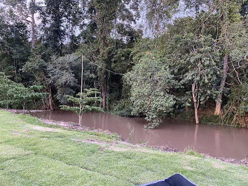 ทิวทัศน์สวยงามด้วยลำธารไหลผ่าน ลานหญ้าเขียวขจี และต้นไม้ร่มรื่น ให้ความรู้สึกสดชื่นและเป็นธรรมชาติ