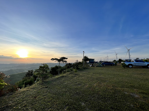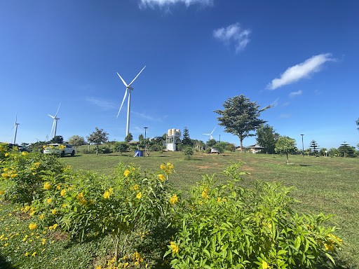 วิวกังหันลมที่สวยงามสุดตระการตา เหมือนได้นั่งชมภาพวาดธรรมชาติแบบ 360 องศา มีวิวภูเขาและทุ่งหญ้าเขียวขจีให้เพลิดเพลิน